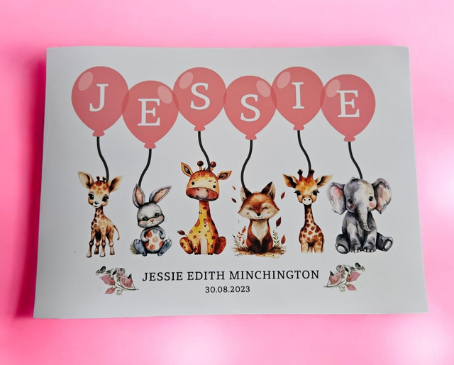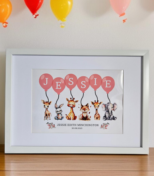 A sweet and whimsical design featuring adorable little animals holding balloons that spell out your chosen name- the perfect personalised touch for any nursery or child’s room 🤍