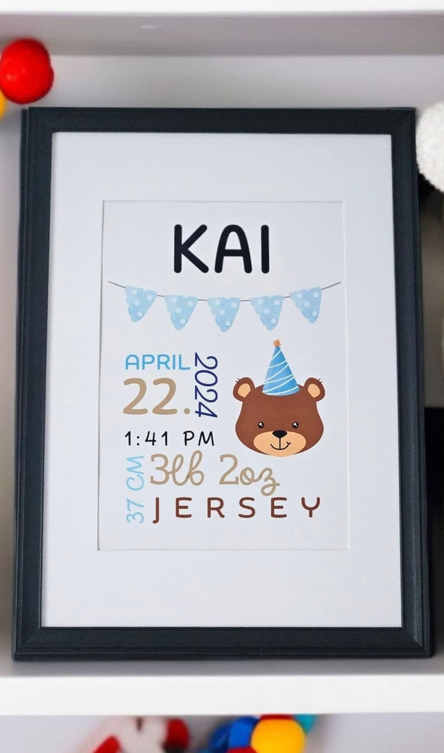 A classic blue teddy design with soft bunting and your baby’s name 💙