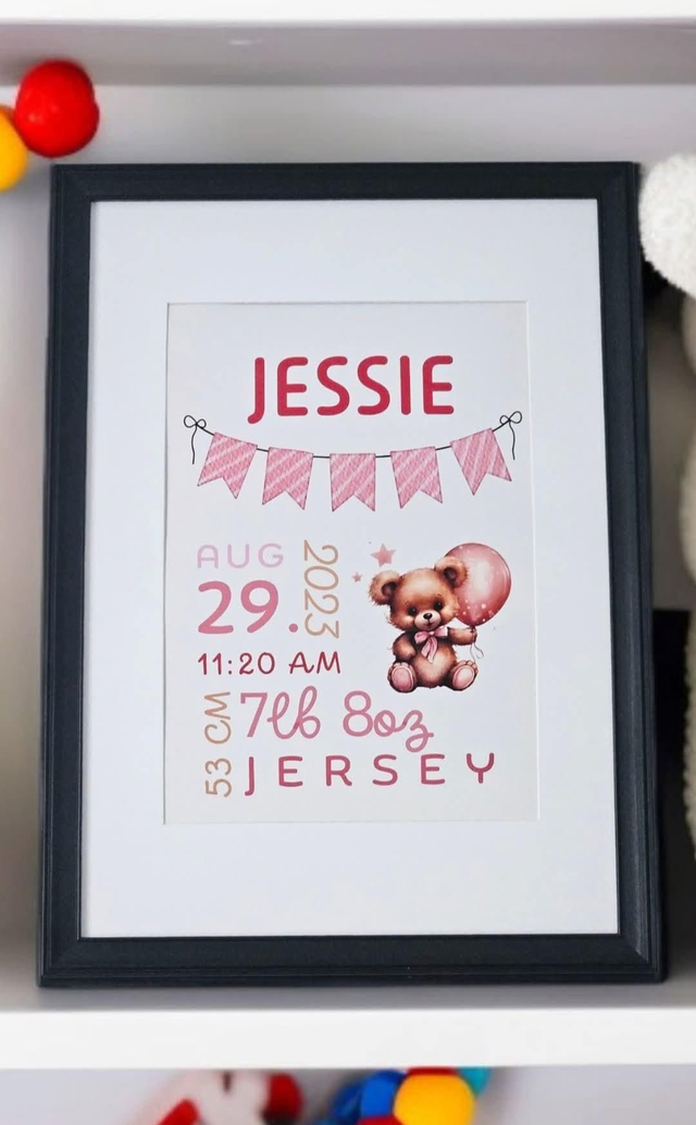 A gentle pink teddy design with personalised bunting and your little one’s name 🌸