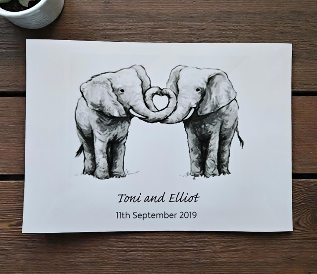 A tender and romantic illustration featuring a sweet pair of elephants, symbolising love, strength and togetherness. Personalised with names and a meaningful date underneath, this print makes a beautiful keepsake for couples and a perfect gift for anniversaries, weddings or Valentine’s ✨