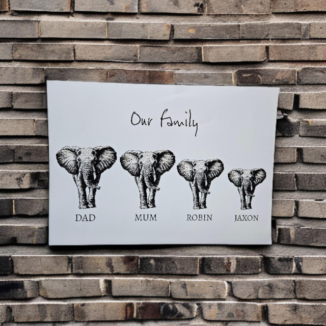 Featuring a little family of elephants sitting together- personalised with your family’s names underneath, and optionally your family surname (e.g. The Smith Family). A beautiful keepsake for your home or a thoughtful gift for loved ones ✨