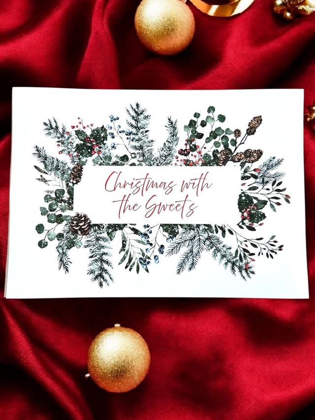 Rectangular wreath print with festive greenery, berries, and your family name.