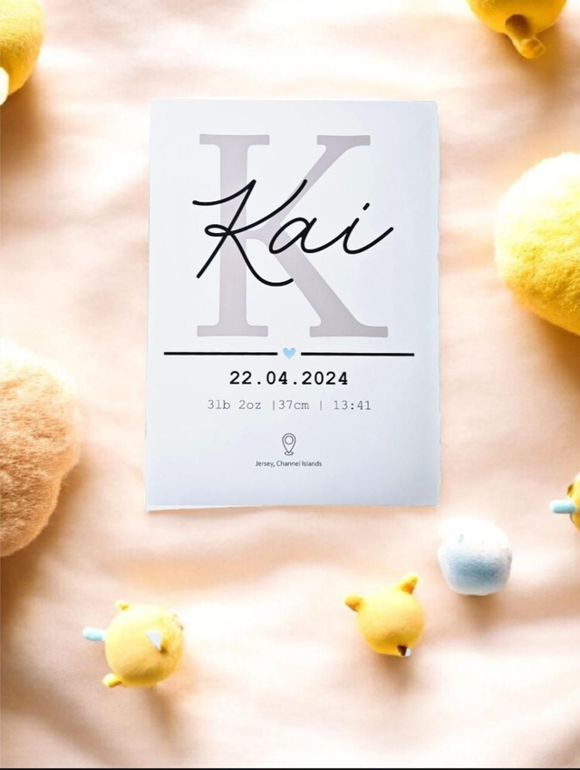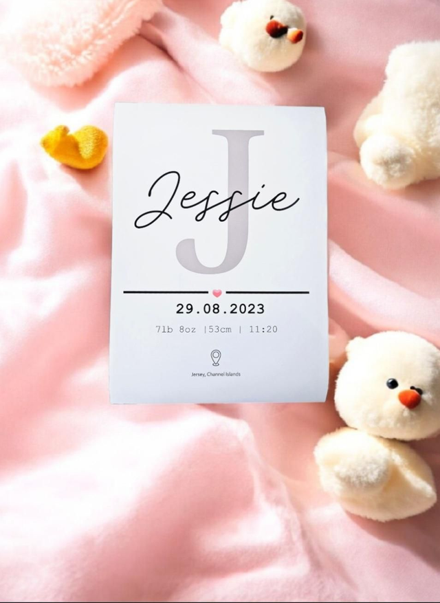A timeless print featuring your baby’s name, birth details, and a blush pink or blue heart 🌸
